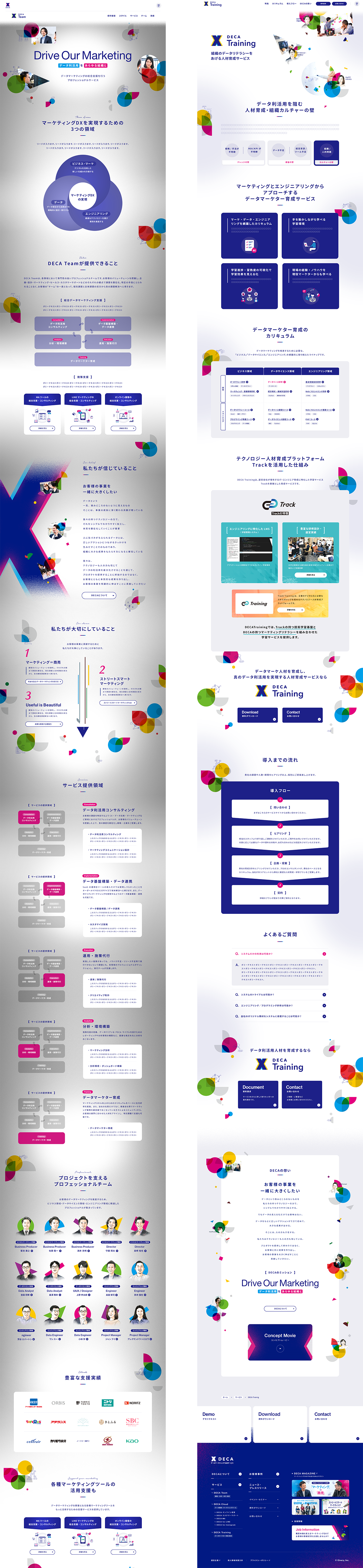 DECAが描く想いを具現化するため、事業ミッションの策定から行ったブランディングプロジェクト。数多な競合ひしめくマーケティング業界で、ブランドとしての独自性を打ち出すためイメージボードの作成、サービスロゴ開発、インタラクションも含めたDECAらしいWebサイト制作を行い、アイデンティティを表現することにこだわったプロジェクト。ADとしてデザイン全体の監修を務めさせていただきました。